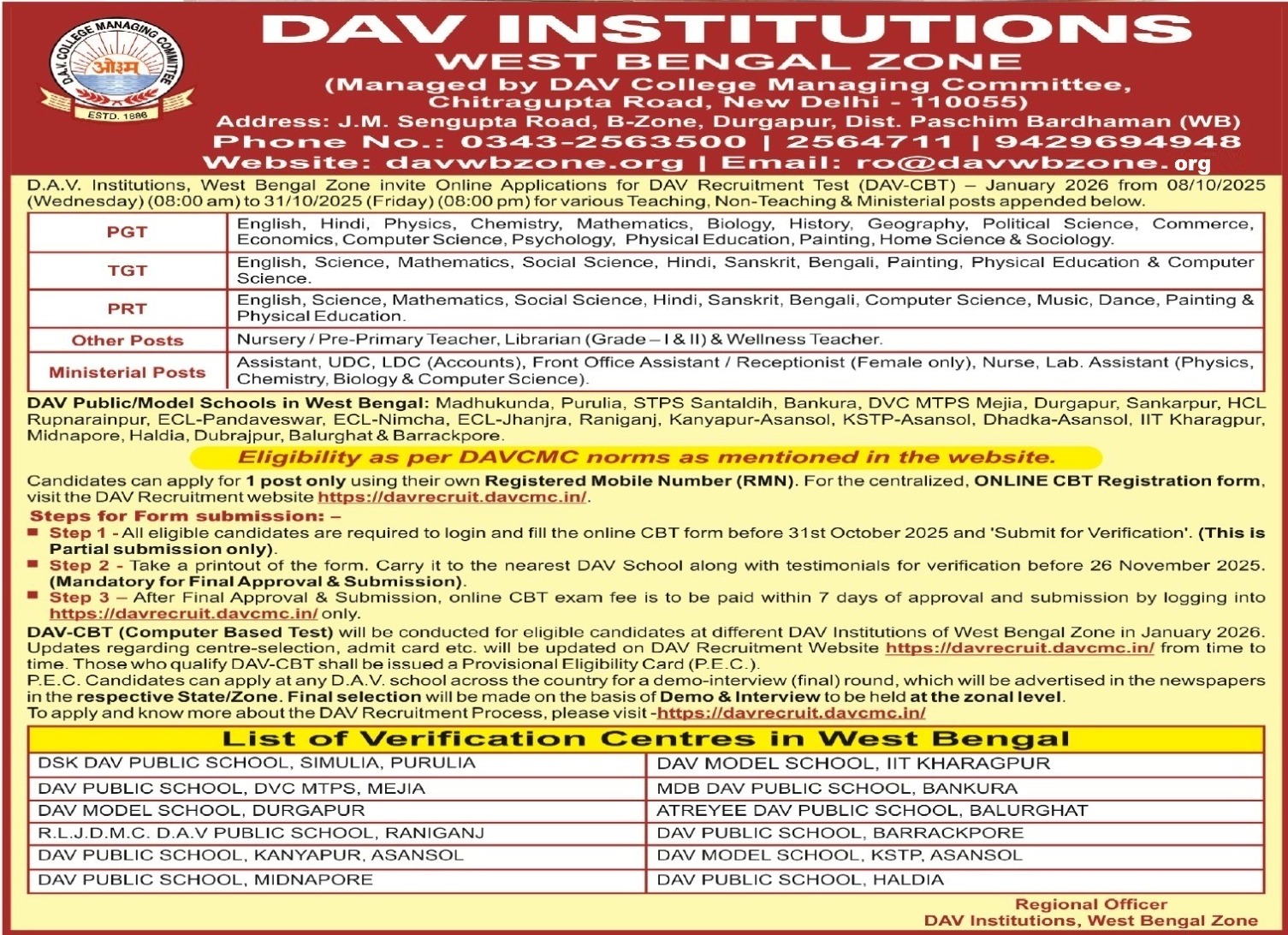 DAV INSTITUTIONS, WEST BENGAL ZONE J.M. SENGUPTA ROAD, B-ZONE, DURGAPUR, PASCHIM BARDHAMAN, WEST BENGAL - 713205 E-Mail: davwbzone@gmail.com Phone No.: 0343-2563500 / 2564711 Website: www.davwbzone.org
